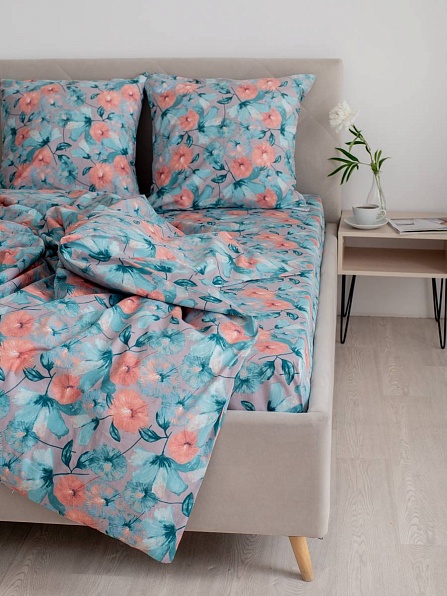 Комплект постельного белья, поплин, Вальс цветов, с молнгией (голубой)