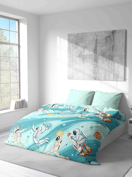Пододеяльник с молнией, Космос с компаньоном клетка (голубой)