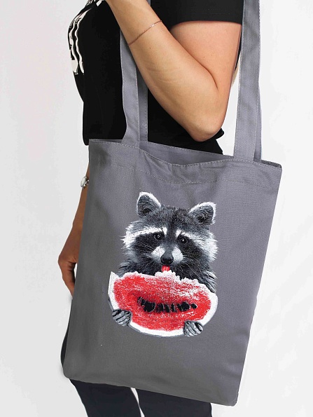 Сумка шоппер, Енот с арбузом (светло-серая)